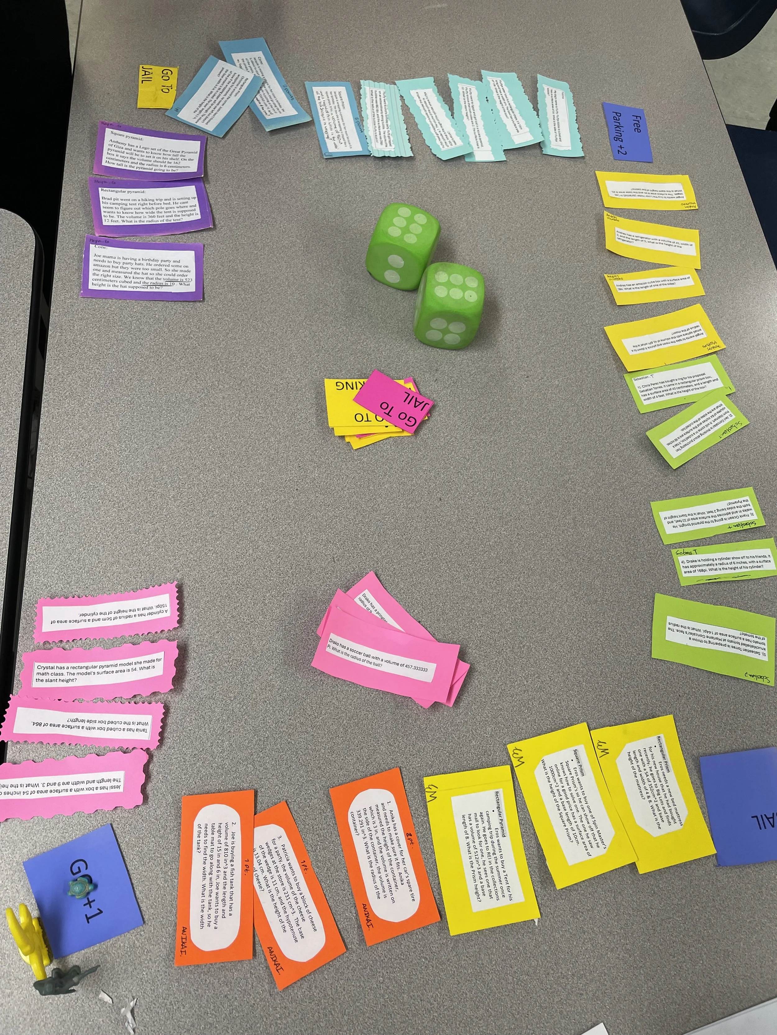 ONE GO, ONE FREE PARKING, ONE JAIL, ONE GO TO JAIL CARDS. There is an example set up on the whiteboard by the names and the picture below.